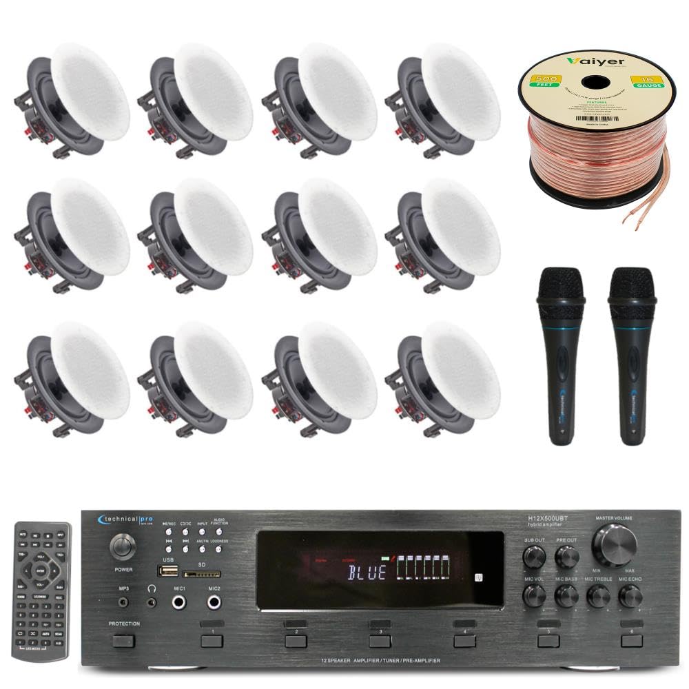 Home Audio System Kit - 6 Channel 6000 W Bluetooth Amplifier w/ 12 Qty of 6.5" in-Wall in-Ceiling Speakers 200 W Each, 2 Qty of Wired Mic, 500 ft Speaker Wire & Remote by Technical Pro