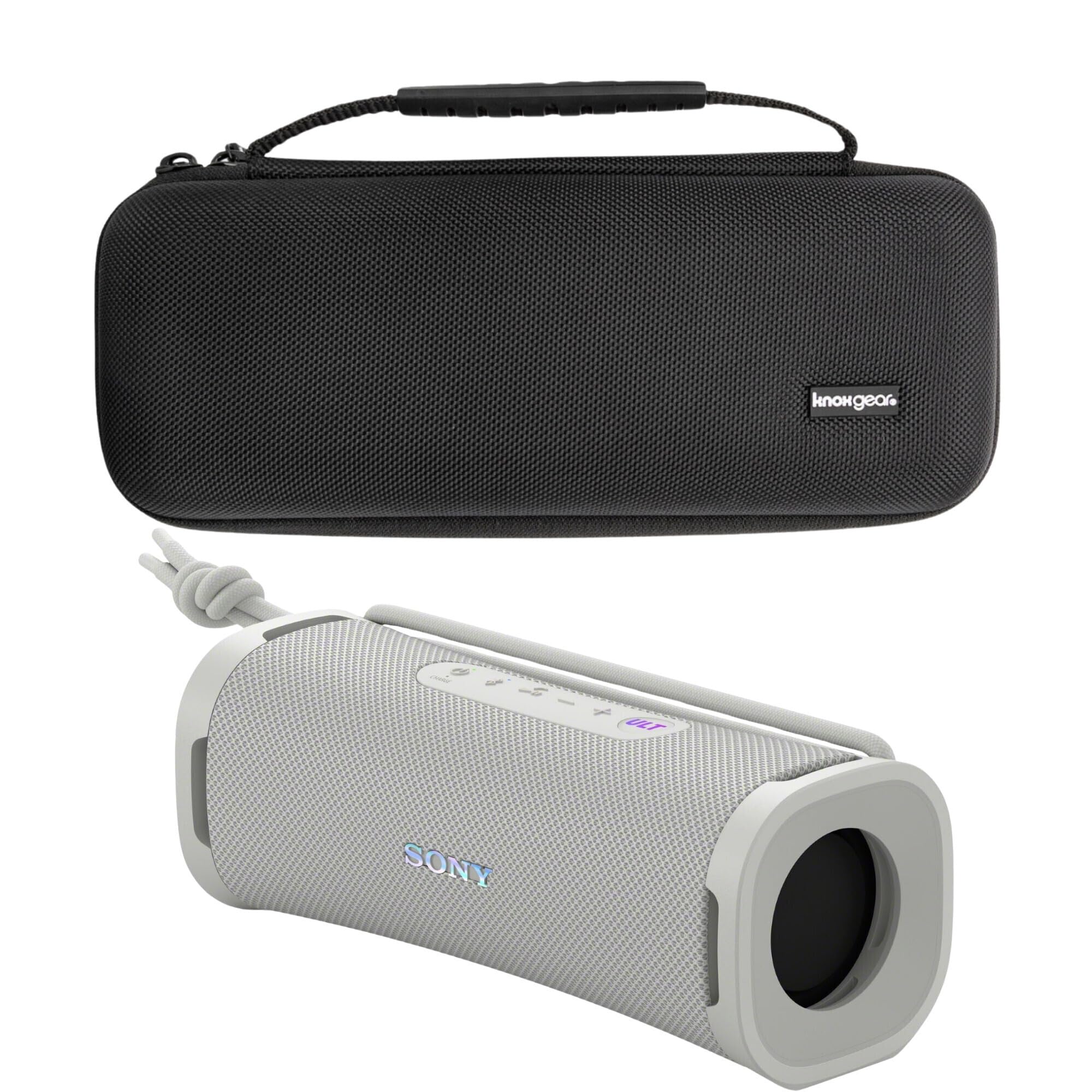 The Sony ULT Field 1 speaker (off-white) and a hardshell protective case designed specifically for Bluetooth speakers.